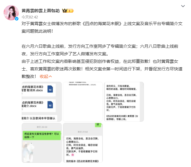 对于黄霄雲女士微博发布的新歌《四点的海棠花未眠》上线文案及音乐平台专辑简介文案问题就此说明!在六月六日歌曲上线前,发行方向工作室同步了专辑简介文案;六月八日歌曲上线前夜,发行方向工作室同步了艺人微博发布文案。