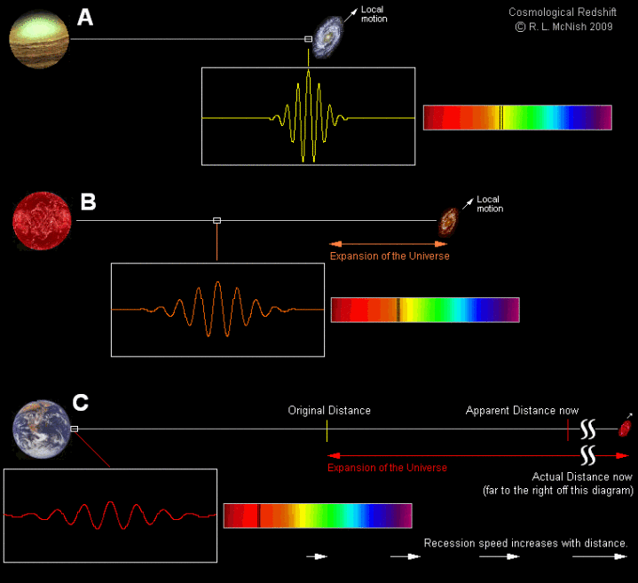 光,或者任何波动信号,齐可能以特定的波长辐射,但寰宇的扩张会在传播经由中拉伸其波长。举例,对于134亿年前的星系,紫外线辐射的光会发生红移,一直延长到红外线波段;引力波也会发生雷同的拉伸。寰宇扩张速率越快,来自远处天体的辐射红移就越大,这些信号也就越微弱。图片起首:Larry McNish / RASC 卡尔加里