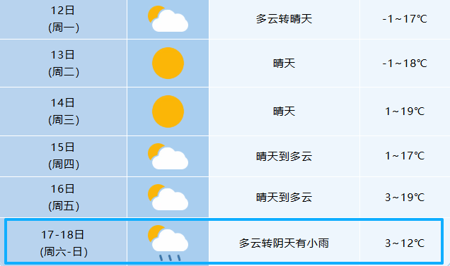 17日:淮河以北阴天,部分地区有小雨;淮河以南多云。