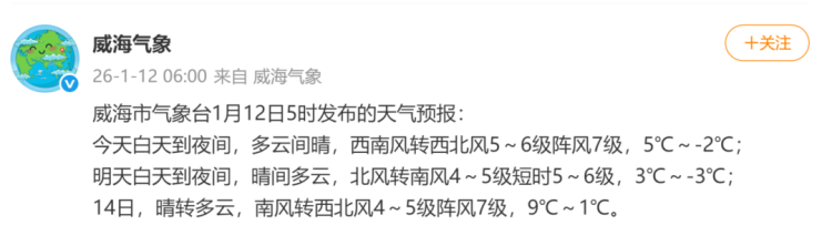据威海市气象台1月12日5时发布的天气预报:今天(12日)白天到夜间,多云间晴,西南风转西北风5级至6级阵风7级,5℃至-2℃。