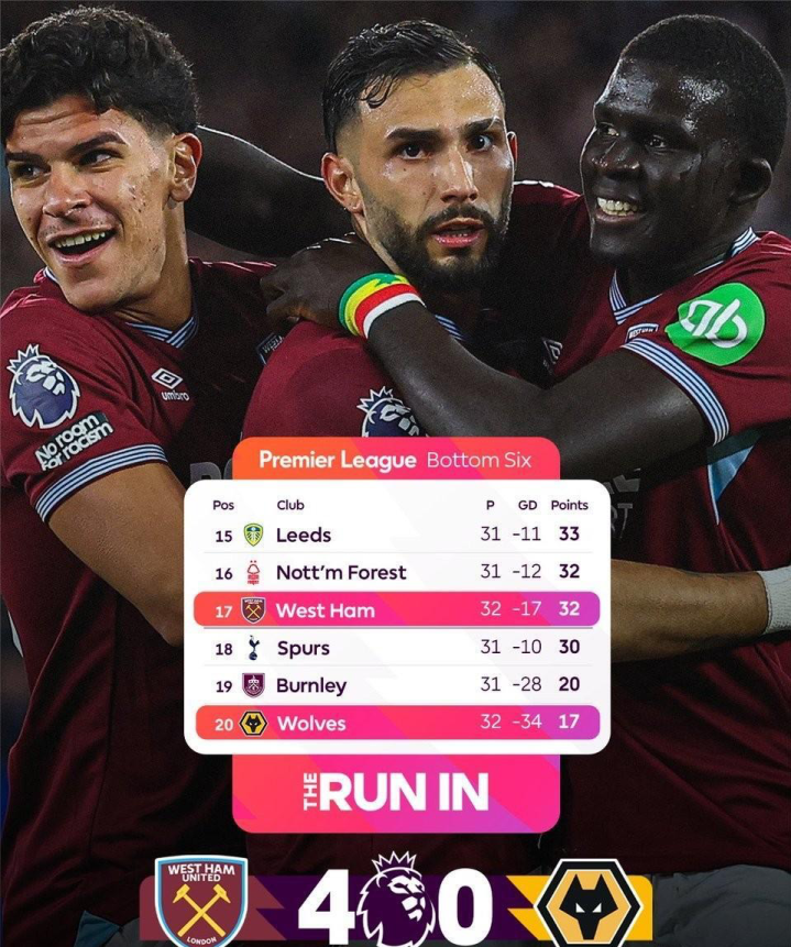 北京时分4月11日,英超第32轮一场备受暖热的“保级大战”打响。最终西汉姆联在主场4-0大捷狼队,主场5轮不败后,顺利逃出左迁区。而热刺也在本轮未赛情况下,暂时跌入英超左迁区。