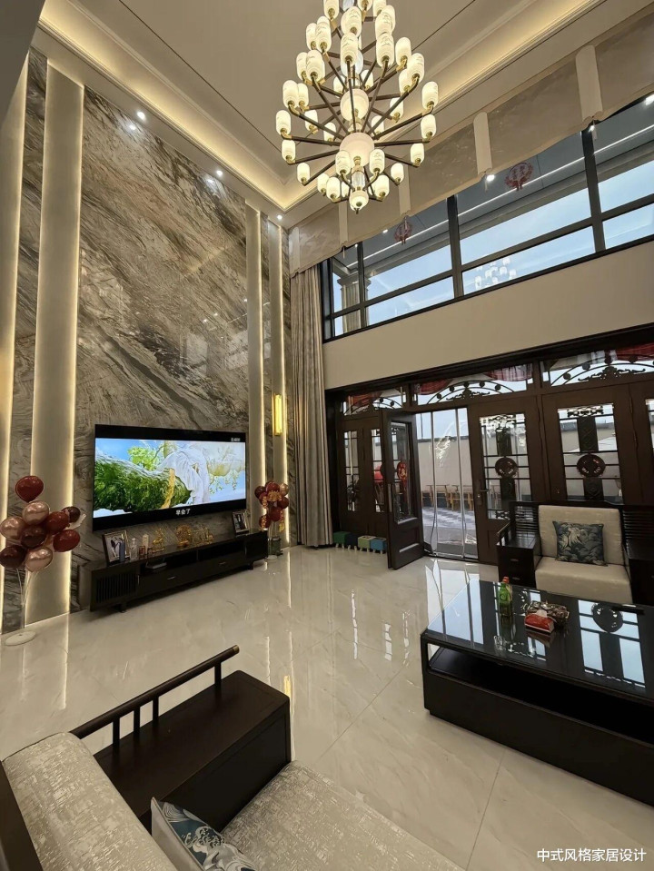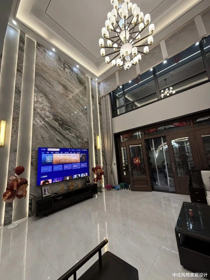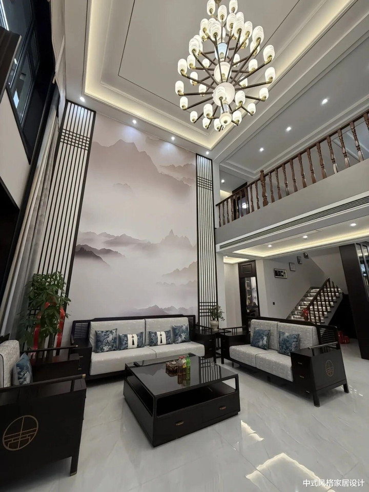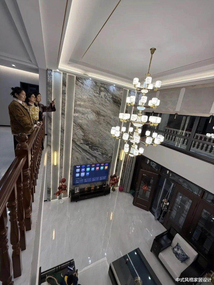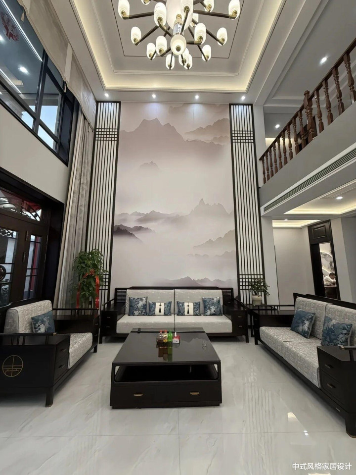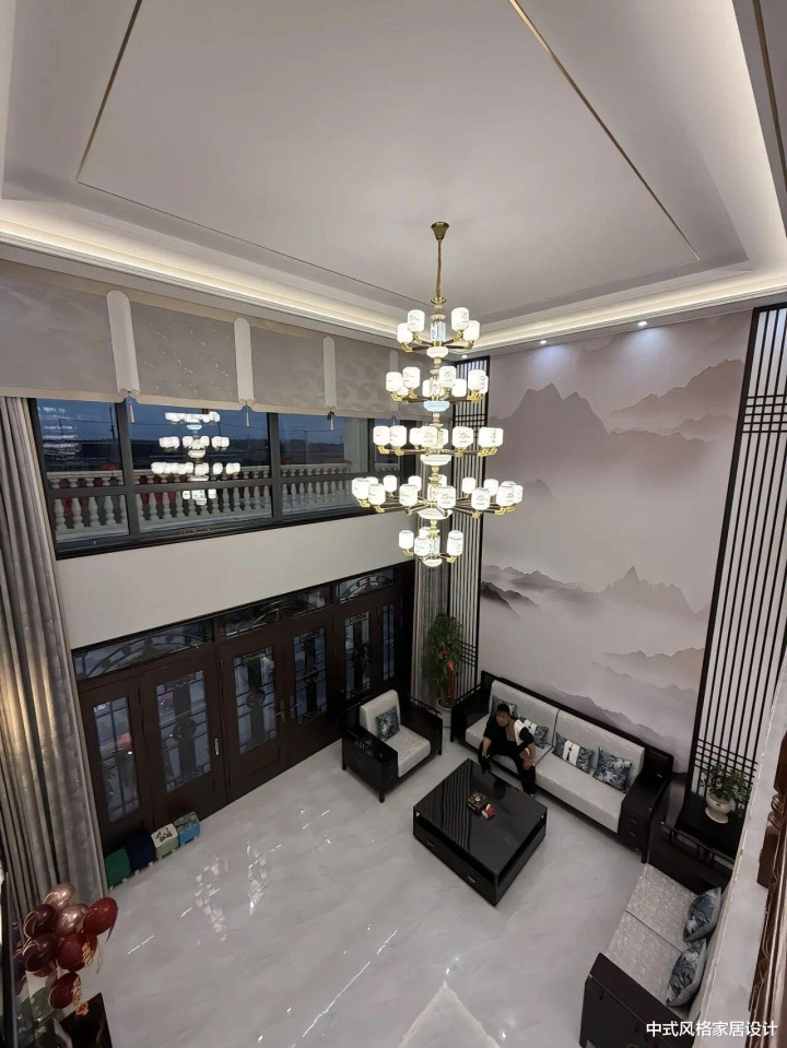 挑高推敲的新登科客厅,举座千里稳大气又不失斯文。客厅中央摆放着深色实木框架沙发,搭配浅灰软包与青花瓷纹样抱枕,前线是同色系方形茶几,兼具实用与登科韵味。沙发配景墙以淡墨山水壁纸为基底,两侧搭配竖条状镂空屏风,既分辨空间又增添档次感。顶部吊挂着造型独有的多头吊灯,暖光搭配镶嵌式筒灯,让空间亮堂柔柔。右侧可见通往二层的楼梯,楼梯扶手与举座作风长入,边际绿植为空间注入期望,处处彰显着传统登科好意思学与当代居住需求的和会。