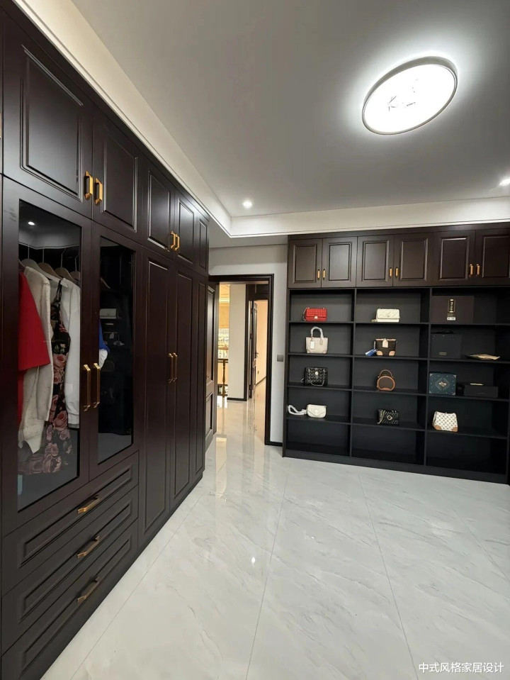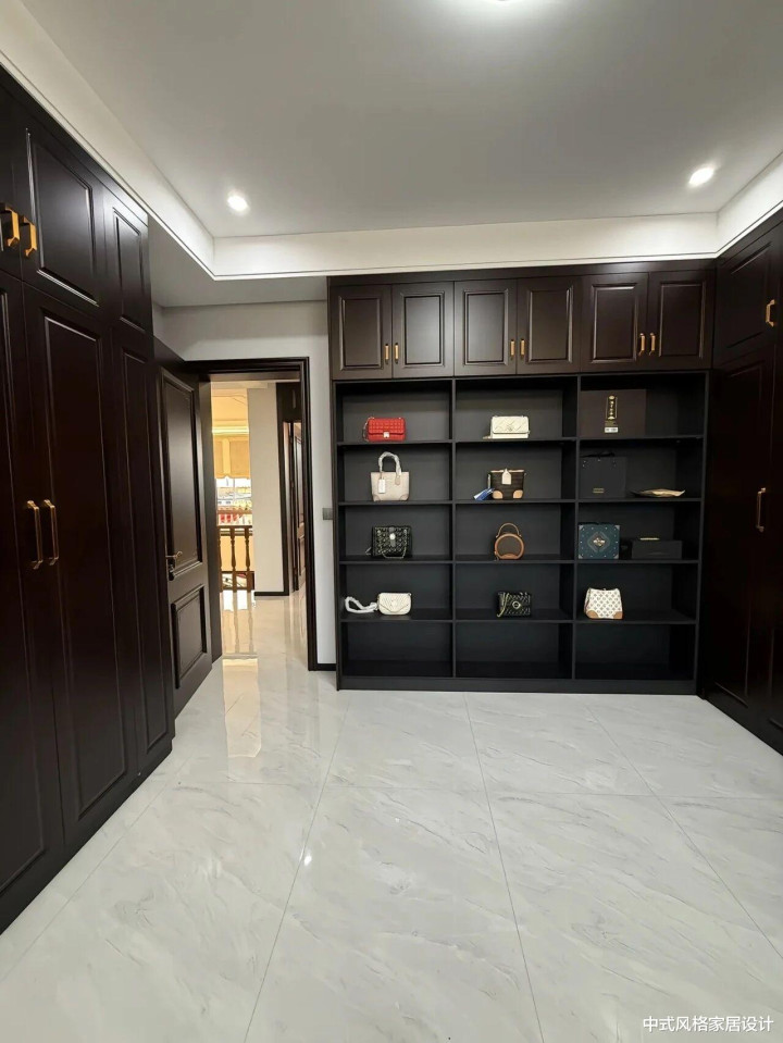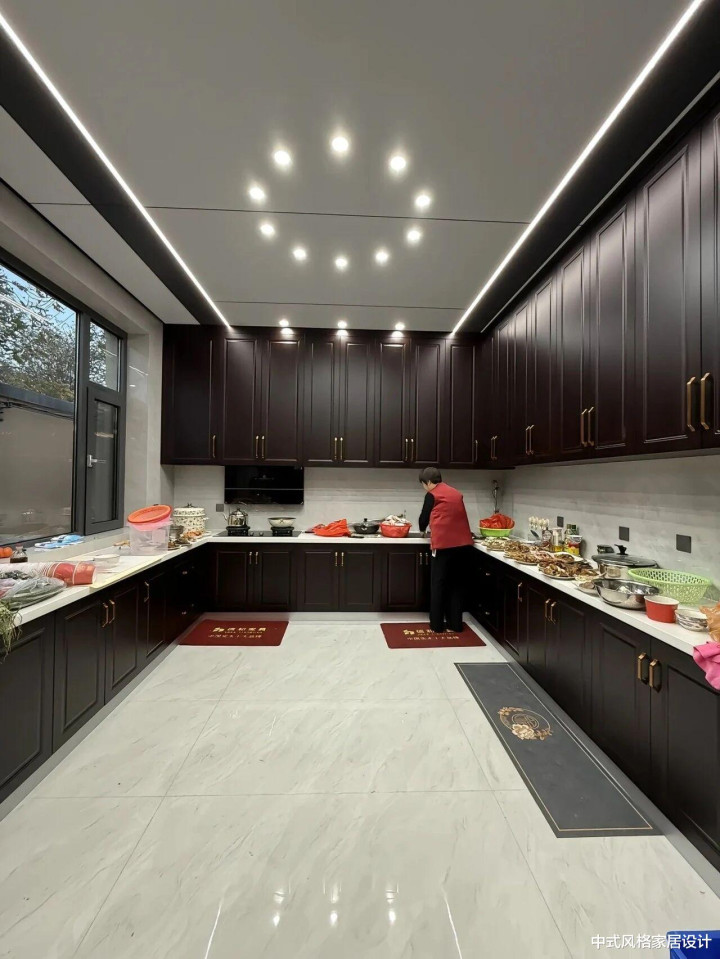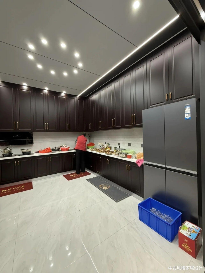 新登科作风的厨房在推敲上充分谈判了实用性。U型的推敲充分欺诈了空间,让烹调经过愈加顺畅。深色的实木橱柜质感实足,金色的把手点缀其中,增添了一点致密感。白色的台面干净整洁,与深色橱柜酿成显着对比。厨房的照明推敲也尽头全心,天花板上的筒灯提供了弥漫的光辉,让烹调过程愈加安全方便。