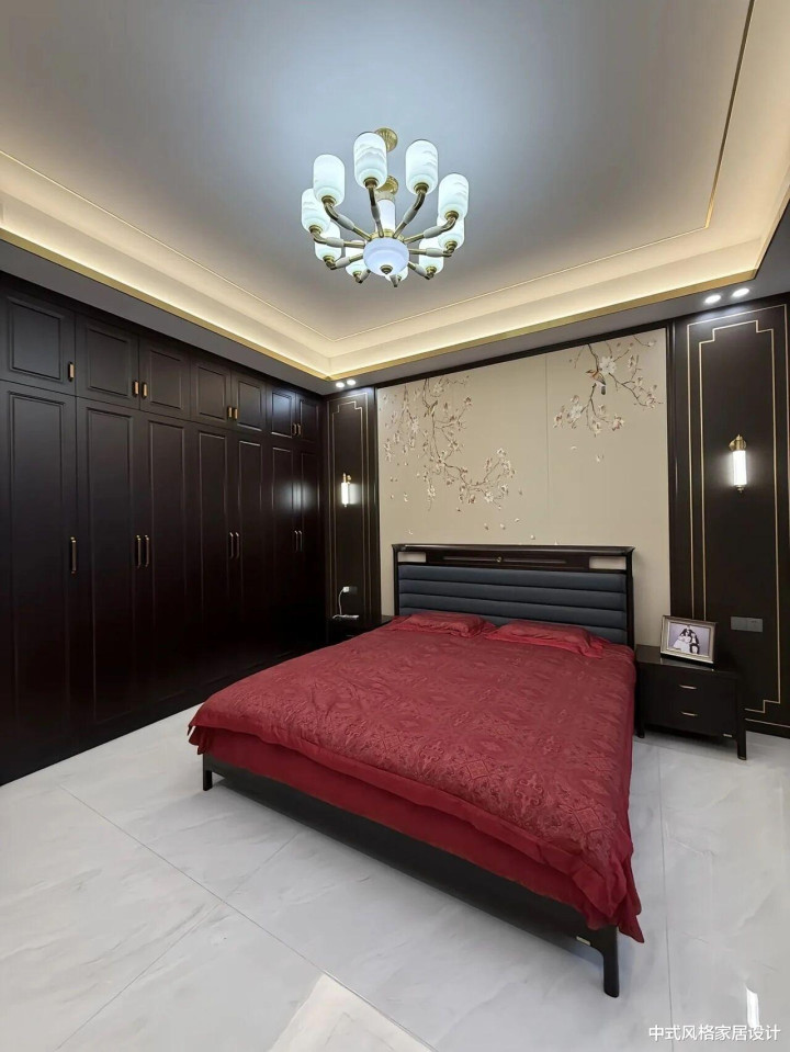卧室是休息的场面,新登科作风的卧室营造出了温馨宁静的氛围。深色的实木衣柜和床头配景墙,展现出千里稳大气的质感。床头配景墙上的登科花鸟壁画,为空间增添了一抹灵动与期望。红色的床品绚丽夺目,与举座的中性色调酿成对比,成为空间的亮点。