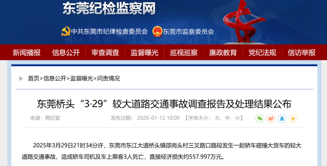 1月12日,东莞纪检监察网发布《东莞桥头“3·29”较大道路交通事故调查报告及处理结果公布》,详情如下: