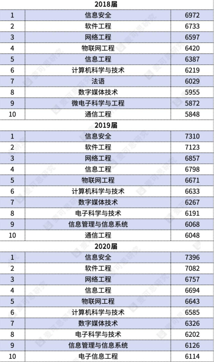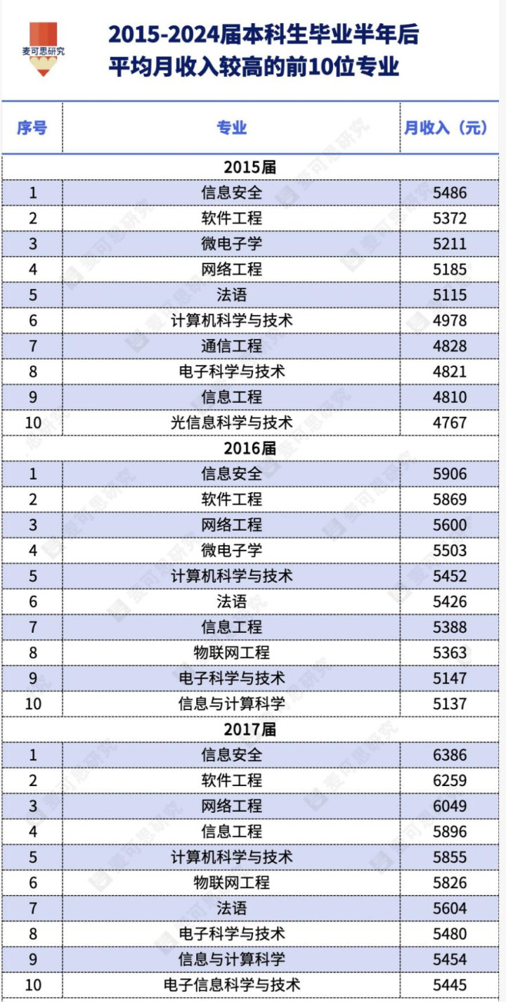 最近麦可念念发布了近十年本科毕业生高薪专科榜单,数据一出来就炸了锅,信息安全稳坐十年第一,软件工程十年不缺席,前十真实全被理工科包揽,完竣印证了往常十年互联网与科技行业的黄金期间。