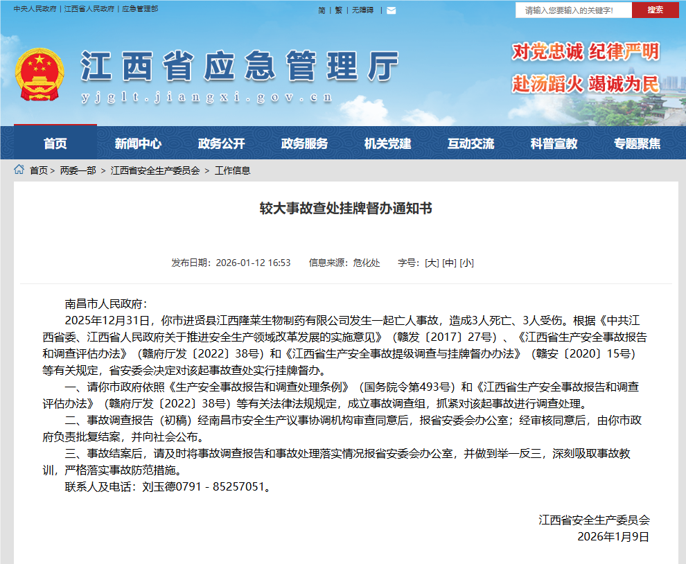 1月12日,江西省应急管理厅发布了进贤县江西隆莱生物制药有限公司发生安全生产事故致3人死亡的较大事故查处挂牌督办通知书。通知书显示,该事故由江西省安全生产委员会挂牌督办。
