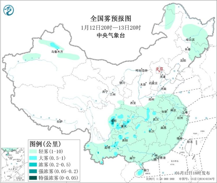 12日夜间至13日早晨,新疆天山北坡、四川盆地中南部、贵州西部、云南中南部有大雾天气,局地能见度不足200米。