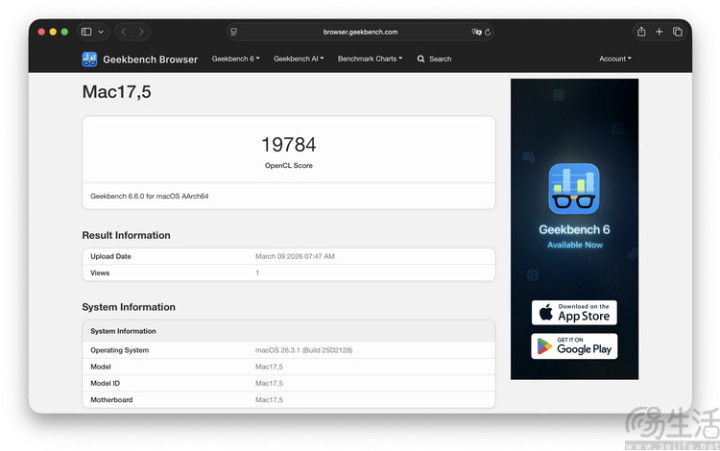 在GPU方面,咱们使用OpenCL API运行GeekBench测试,MacBook Neo的得分与隔邻骁龙X Elite的水平险些一致,高于Intel Arc 140T,略逊于AMD Radeon 780M的极限水平。
