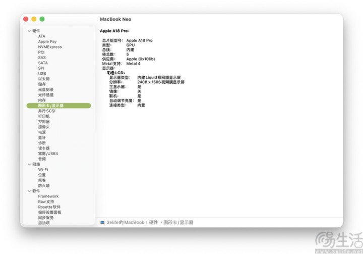 说到这块屏幕,MacBook Neo取舍的是13英寸、2408*1506(14.3:9)分辨率的IPS液晶屏,刷新率为60Hz,维持10亿色自满和500nit峰值亮度。