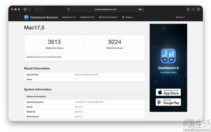 当先咱们用GeekBench 6.6进行了测试,在齐集电源的情况下,在室温环境测得单核3613、多核9224分。