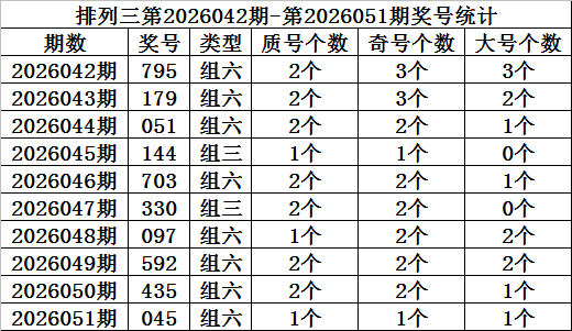 上期回来:罗列三第2026051期开奖:045,质合比为1:2,奇偶比为1:2,大小比为1:2。