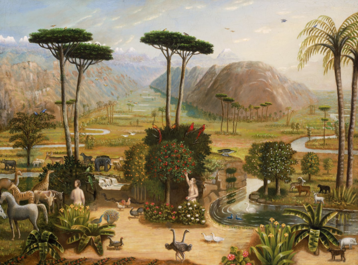 即便如斯,在这首看似梦境的“视觉旋律”中,仍然存在着难以冷落的节拍变化。好意思国民间艺术家埃拉斯特斯·索尔兹伯里·菲尔德(ErastusSalisburyField)1860年的《伊甸园》,以夸张的透视、扎眼的直率以及略显拙劣的东谈主物与动物形象,与庞贝的古典雕镂和萨金特的良好绘图造成热烈对比。它似乎在宣告:莫得东谈主信得过领有伊甸园。这种带有民主意味的抒发,组成了对精英式猖厥倡导的一种反击。