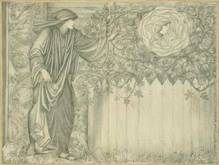 爱德华·科利·伯恩-琼斯(SirEdwardColeyBurne-Jones),《花圃中的朝圣者》,出自乔叟《玫瑰神话》,1881年,玄色粉笔与石墨,纸本拼接