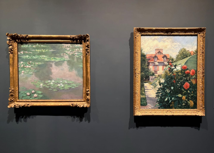 左:莫奈,《睡莲》,1905年;右:古斯塔夫·卡耶博特,《小热讷维耶花圃的大丽花》
