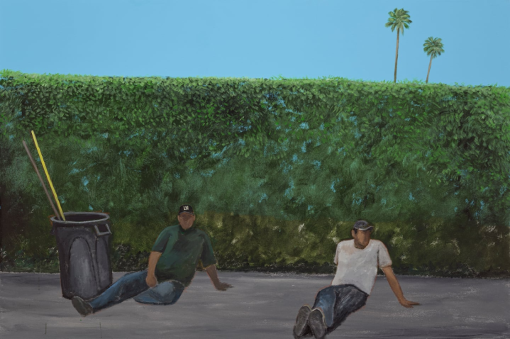 不才一展厅,一幅取材自奥维德《变形记》的17世纪弗拉芒织毯与好意思国画家杰·林恩·戈麦斯(JayLynnGomez)2019年的绘图《休息》比肩。画面出路中,两名工东谈主在高耸的绿篱前的东谈主行谈上疼痛地坐着,身旁是器具与垃圾桶,但他们的休息之处是花圃外,在酷热的混凝土上,而不是在那片修剪整皆、阴寒宜东谈主的草地之中。