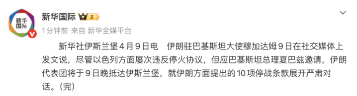 此前据新华社,伊朗驻巴基斯坦大使穆加达姆9日在外交媒体上发文说,尽管以色列方面多次违背息兵公约,但应巴基斯坦总理夏巴兹邀请,伊朗代表团将于9日晚抵达伊斯兰堡,就伊朗方面漠视的10项停战条目张开严肃对话。