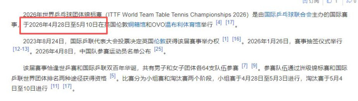 伦敦世乒赛举办期间为4月28日至5月10日。