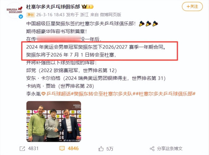 樊振东与德甲俱乐部签有认真办事合同,合约直至5月底到期。