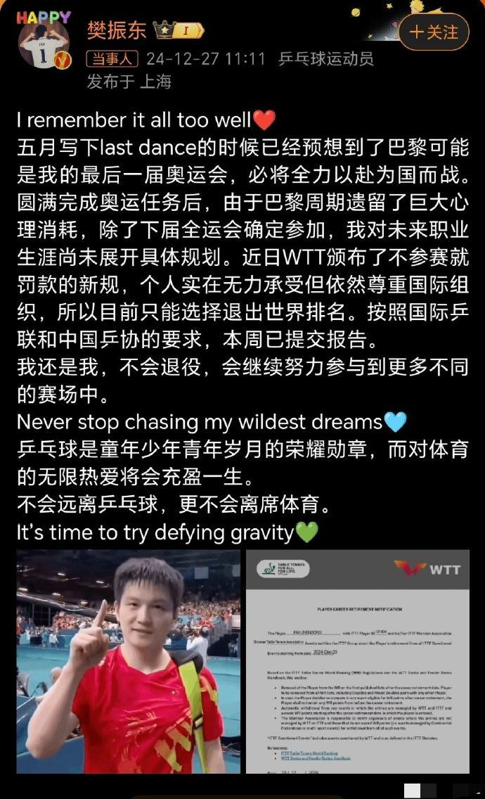 2024年底,樊振东就公建筑声,退出WTT宇宙排行。
